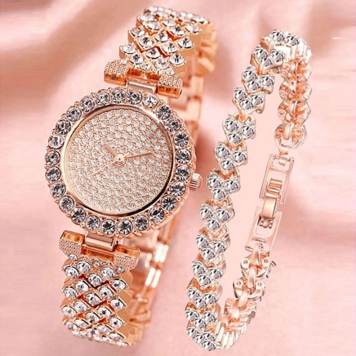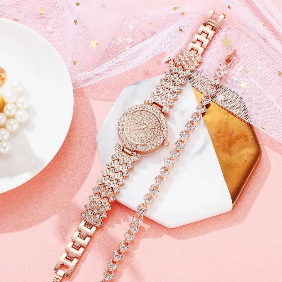This rose gold watch with bracelet is shiny and stylish. The watch has crystal stones that sparkle, and the bracelet also matches perfectly. Together, they make a beautiful set. You can wear it every day, and it also looks great at parties or weddings.