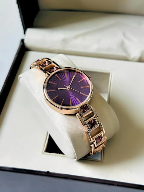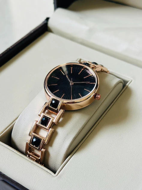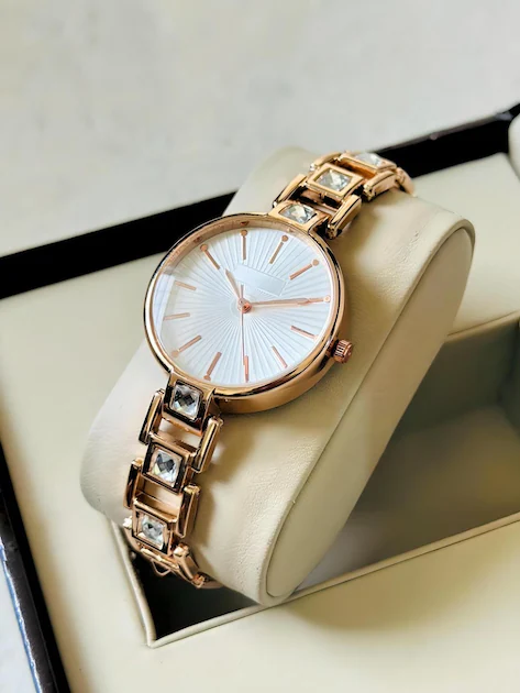 This rose gold womenβs watch looks stylish and elegant. The white dial gives it a classy touch, and the diamond-style strap also makes it shine more. You can wear it every day, and it also looks great at parties or weddings.